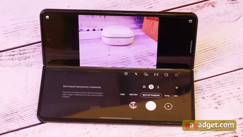 Innym całkiem realnym scenariuszem wykorzystania smartfona w trybie półotwartym są aparaty fotograficzne. Przy korzystaniu z głównej kamery otrzymujemy coś w rodzaju statywu. A podczas prowadzenia rozmów wideo z przodu nie musisz trzymać smartfona w rękach.