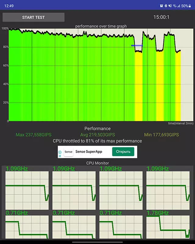 Procesor Snapdragon 888 ma pewne problemy z przegrzewaniem się. W Samsungu Galaxy Z Fold3 o dziwo zachowuje się on stosunkowo poprawnie. Dopiero pod koniec 15-minutowego testu wystąpiły chwilowe zwisy na poziomie prawie 70%. Obudowa nagrzewa się w pobliżu kamery, ale jest to minimalne nagrzewanie.