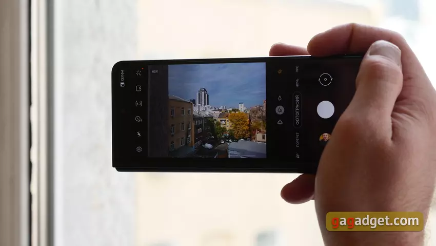 Aplikacja aparatu wygląda znajomo: tryby są przełączane za pomocą poziomego przewijania, dodatkowe są ukryte w pozycji "Więcej", można je przeciągnąć na główną listę, a kolejność trybów można dostosować do własnych upodobań. Wszystkie podstawowe ustawienia, w tym lampa błyskowa, filtry, współczynnik proporcji i zoom znajdują się na głównym ekranie. Zoom może być regulowany bezstopniowo lub przy użyciu stałych ustawień. Tryb Multi-camera z jednoczesnym fotografowaniem z różnych aparatów w różnych trybach jest również obecny.
