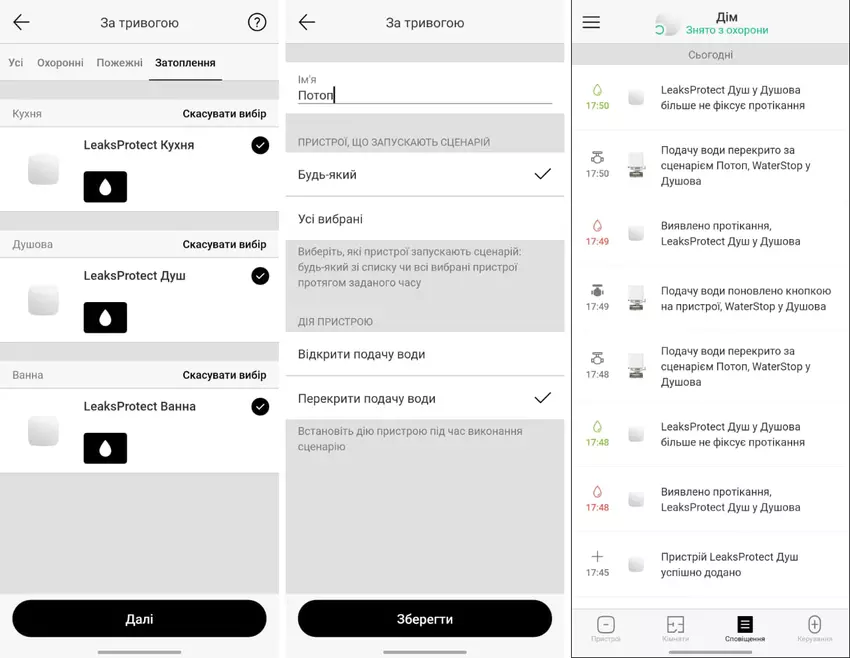 Oczywiście najważniejszą rzeczą, do której WaterStop jest potrzebny, jest scenariusz wyłączenia przez alarm (sygnał z czujnika LeaksProtect). Nie do końca rozumiem sens otwierania dopływu wody w momencie zadziałania detektora wycieku, ale tak jest. Oczywiście moim scenariuszem (głównym dla użytkownika WaterStop, jak sądzę) jest odcięcie wody.
