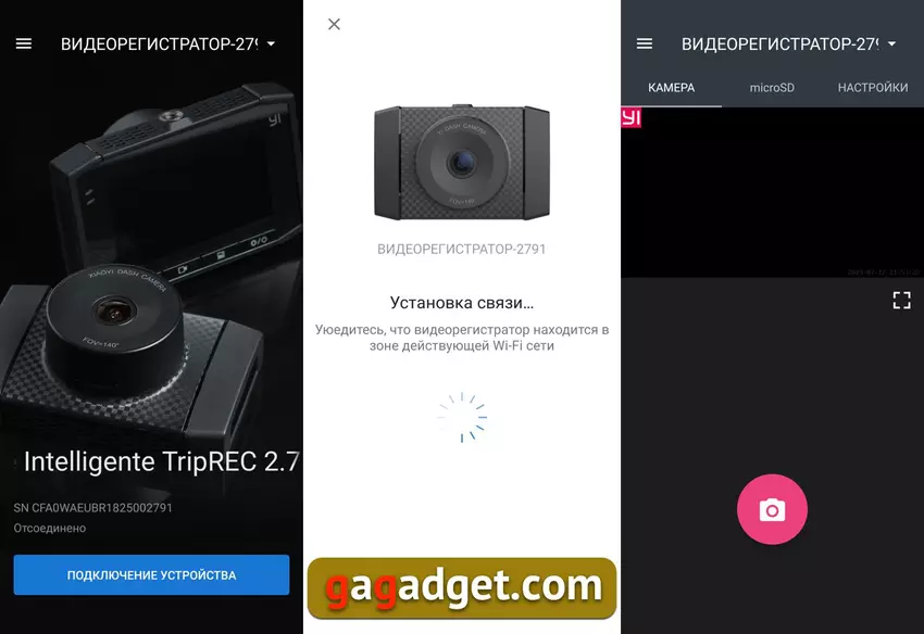 Do komfortowej pracy z rejestratorem (na ogół można się nie przejmować - jest wyświetlacz i menu OSD, to działa i bez pomocy smartfonu), aby zainstalować aplikację oprogramowania Yi Dash Cam (ono jest, oczywiście, również dla iOS ). W menu rejestratora musisz włączyć Wi-Fi, po którym smartfon jest podłączony do sieci rejestratora i uzyskać dostęp do ustawień i zawartości karty pamięci.
