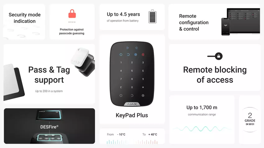 Nowa generacja bezprzewodowej klawiatury cyfrowej KeyPad Plus obsługującej karty i breloki zbliżeniowe. Pozwala na usunięcie systemu z alarmu bez wprowadzania haseł, jednym dotknięciem karty lub breloka. Pass and Tag są wyposażone w chipy DESFire wykorzystywane w systemach transportowych stolic europejskich i NASA. Ochrona jest oparta na standardzie ISO 14443 i zapewnia 128-bitowe szyfrowanie i ochronę przed kopiowaniem. Jedna karta Pass lub brelok do kluczy można podłączyć do 13 koncentratorów i używać np. w domu, na wsi czy w biurze. W aplikacji możesz ustawić nazwę i prawa dostępu dla każdej karty lub breloka. Każde działanie jest rejestrowane w dzienniku zdarzeń. Administrator systemu może odebrać lub ograniczyć prawa dostępu w czasie rzeczywistym.