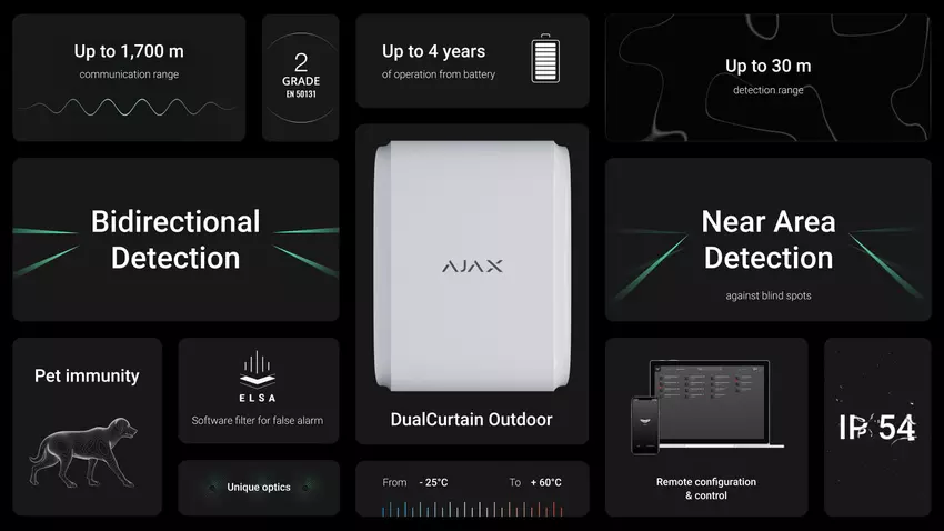 W 2021 roku Ajax Systems zwiększa swoją linię zewnętrznych urządzeń zabezpieczających. Nowa kurtyna zewnętrzna DualCurtain Outdoor wykorzystuje dwa czujniki ruchu kurtyny skierowane w przeciwne strony i działa w odległości do 30 metrów. Nowy algorytm ELSA analizuje dane z dwóch czujników w ułamku sekundy i filtruje fałszywe alarmy systemu bezpieczeństwa na zwierzętach oraz naturalne zakłócenia na ulicy.