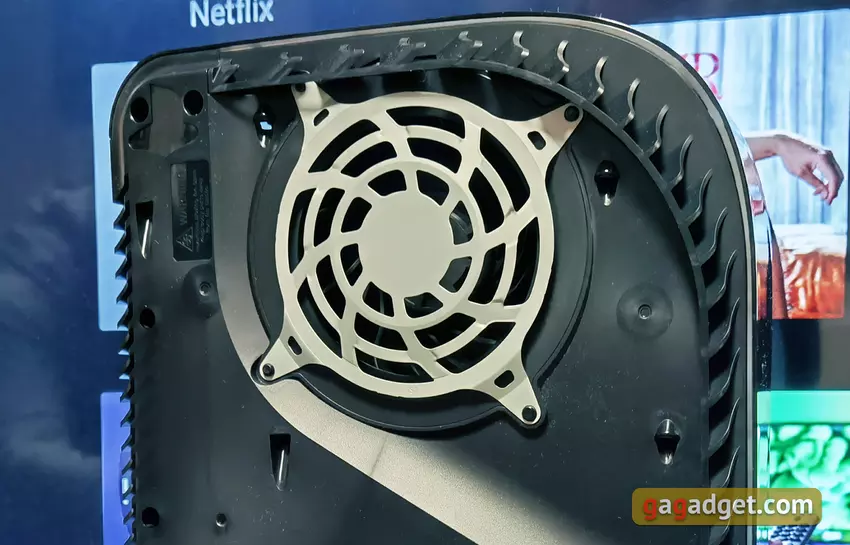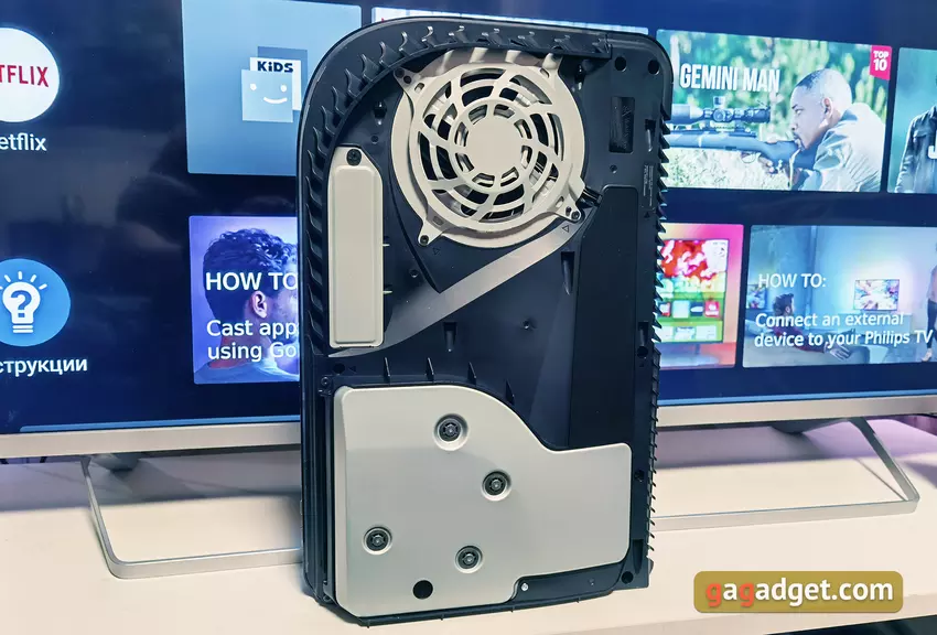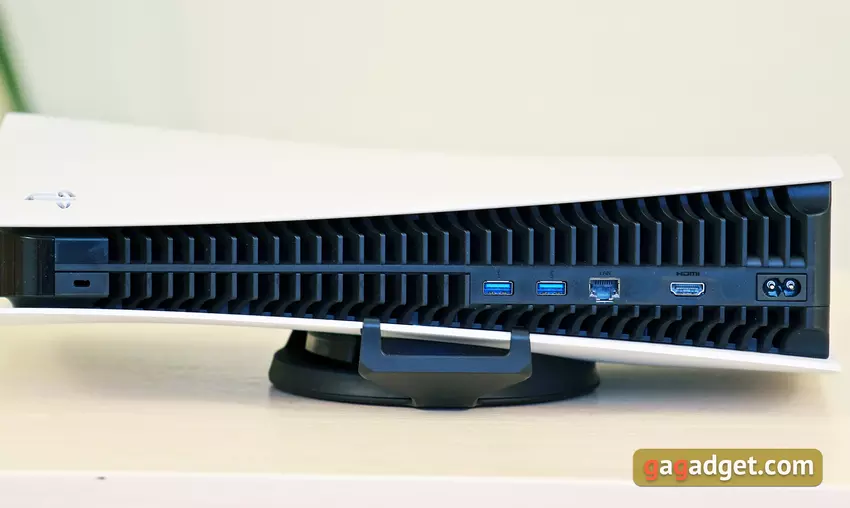 Z drugiej strony historia jest nieco ciekawsza. Napęd optyczny jest widoczny, a tuż nad nim znajduje się kolejna metalowa osłona. To jest złącze SSD M.2. Fizycznie możliwe jest zainstalowanie dowolnego standardowego rozmiaru. Ale jak dotąd ten slot nie jest używany: PS5 nie obsługuje jeszcze rozszerzenia pamięci. Oczywiście pojawi się w przyszłości, ale nie ma jeszcze harmonogramu.