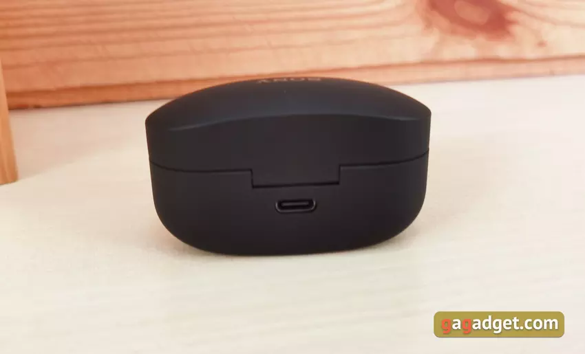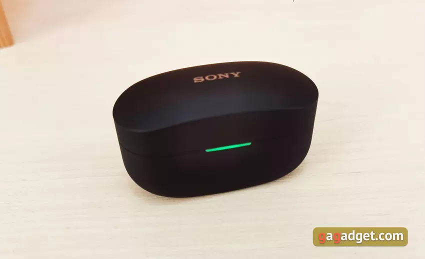Etui ładujące jest dość duże i ma typową konstrukcję typu flip-top.  Na pokrywie znajduje się logo Sony, a z przodu wskaźnik LED ładowania.