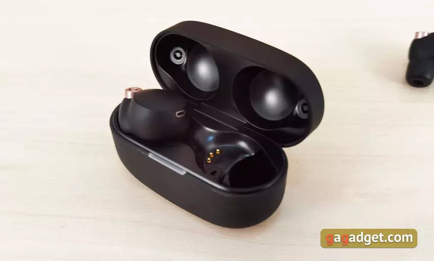 Pokrywa ma samoczynne wykończenie podczas otwierania i jest utrzymywana w zamknięciu za pomocą magnesów.  Pokrywa nie otworzy się przypadkowo.  Ale sama pokrywa ma minimalny luz.  Wewnątrz wszystko jest standardowe: miejsca na słuchawki ze stykami do ładowania.