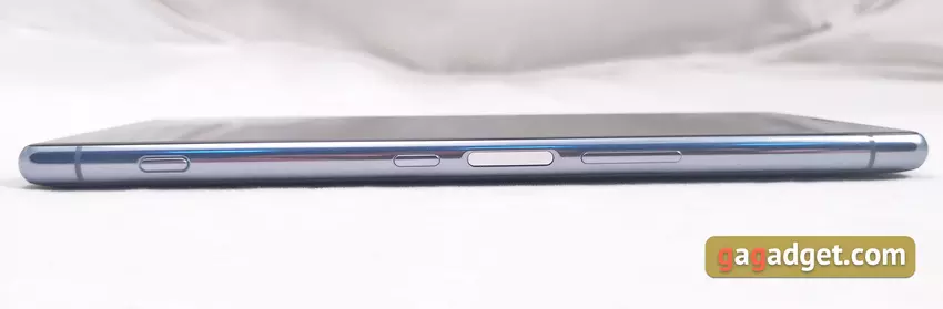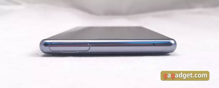 Lokalizacja przycisków i czytnika linii papilarnych jest niezwykła. Widzieliśmy to w Xperii 10 Plus, ale w flagowym Sony Xperia 1 został on wdrożony wygodniej. Skaner linii papilarnych został przeniesiony z tyłu na środek prawej strony. Znajduje się w dogodnym miejscu: kiedy kciuk jest używany z prawą ręką i palcem wskazującym z lewej strony, działa bardzo szybko i dokładnie. Tuż poniżej - przycisk zasilania, powyżej - rocker głośności. W przeciwieństwie do 10 Plus, przyciski wyraźnie wystają ponad obudowę i są wyraźnie wciśnięte. U dołu końca znajduje się przycisk kamery z dwoma pozycjami: