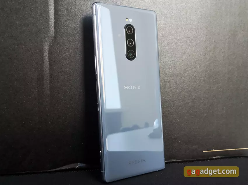 Tylny panel jest szklany, w górnej części znajduje się kamera główna, pośrodku znajduje się logo Sony. Tylna pokrywa jest zaokrąglona po bokach, co zapewnia wygodniejszy chwyt. Co ciekawe, tło na żywo wygląda o wiele atrakcyjniej niż na oficjalnych rendererach. Do nas na recenzję przyjechał „nudny” szary kolor. Na żywo troszeczkę "ucieka" w niebieski odcień i wygląda bardzo dobrze. Również sprzedawana jest czarną wersja. Mniej „nudzące” białą i fioletową, niestety, postanowiono nie dostarczać:
