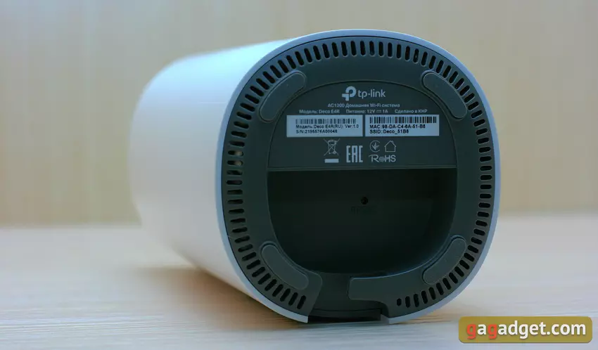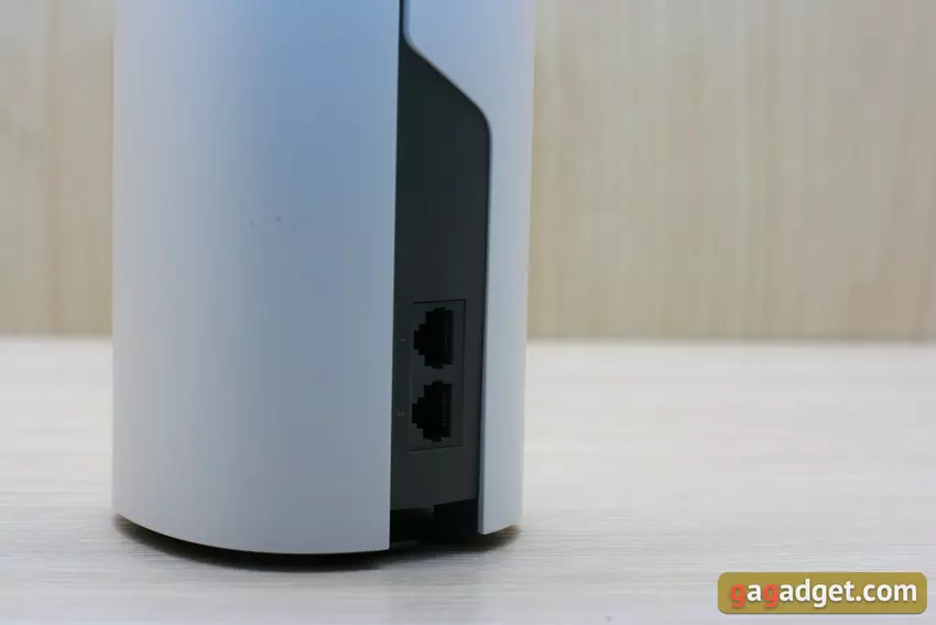 Deco E4R wyposażony w dwa porty RJ-45. Do jednego trzeba podłączyć zewnętrzny kabel internetowy, a do drugiego, na przykład, komputer. Lub nic, jeśli nie potrzebujesz połączenia przewodowego. Do jakiego portu podłączać nie ma znaczenia, system rozpoznaje typ połączenia sam. Urządzenie jest wyraźnie ukierunkowane na sieć bezprzewodową, więc będzie potrzebny osobny przełącznik (może być zawarty w drugi port) do podłączenia wielu urządzeń za pomocą kabli.
