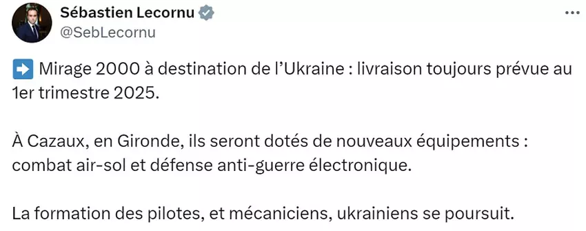 Francuski minister obrony Sébastien Lecornu powiedział, że zgodnie z nakreślonym planem myśliwce wielozadaniowe Mirage 2000 czwartej generacji pojawią się w Ukrainie w pierwszym kwartale 2025 roku.