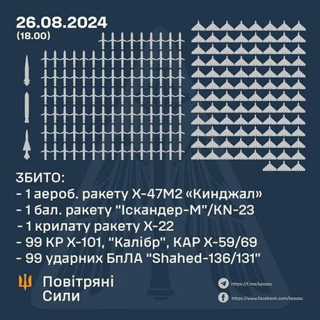 Ukraińskie siły obrony powietrznej zniszczyły 201 z 236 celów powietrznych: 102 pociski rakietowe (ze 127) i 99 bezzałogowych statków powietrznych.