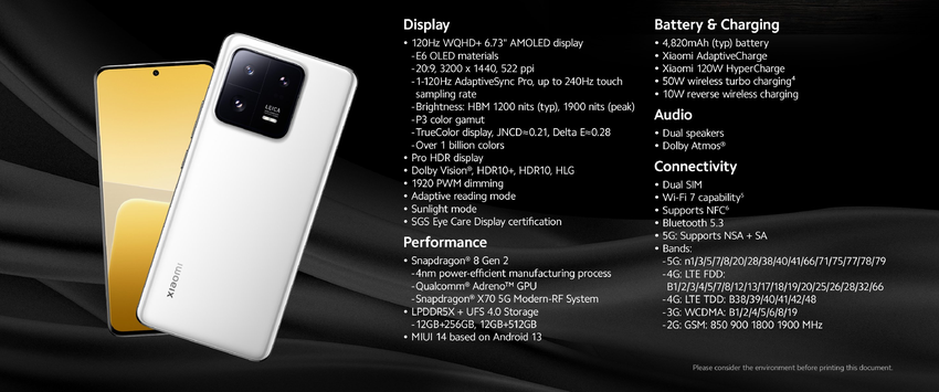 W smartfonie znajdziemy głośniki stereo, Wi-Fi 7, Bluetooth 5.3 LE, NFC, port IR, USB-C 2.0 oraz skaner linii papilarnych wbudowany w wyświetlacz. Obudowa otrzymała stopień ochrony przed wodą IP68. Platformą programową był system operacyjny Android 13 w komplecie z globalną wersją MIUI 14.