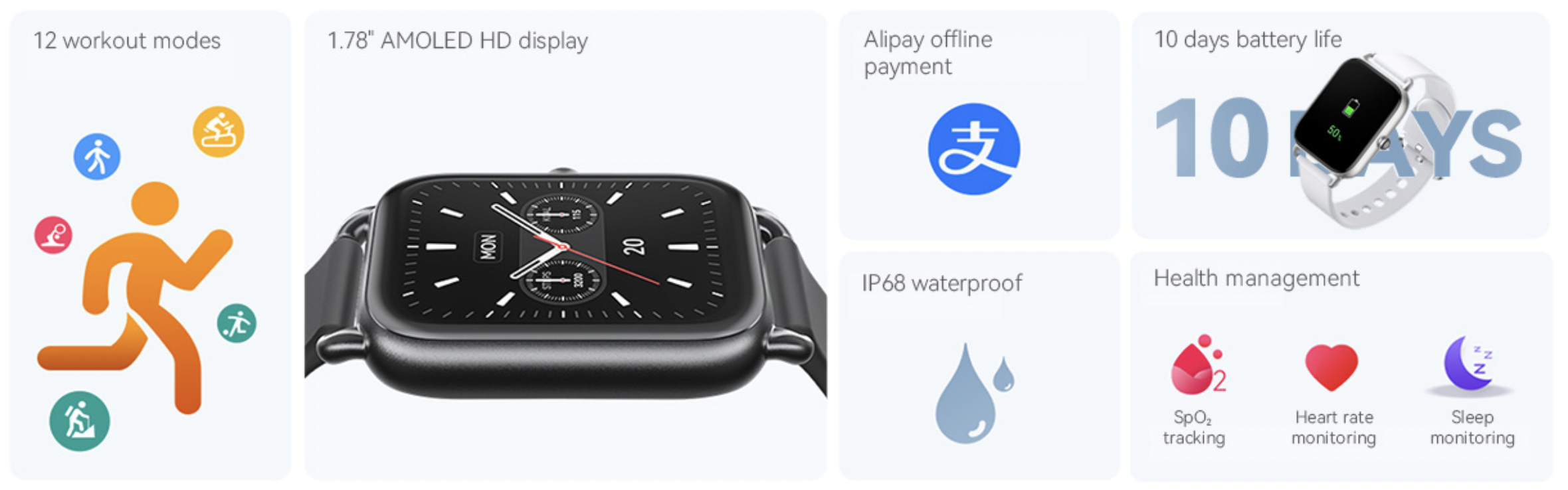 Model nazywa się Haylou RS4. Posiada wyświetlacz AMOLED o przekątnej 1,78". Ekran pokryty jest szkłem z małymi zaokrągleniami po bokach i ma rozdzielczość HD. Zegarek nie boi się wody (stopień ochrony IP68) i może śledzić sen, puls, tlen we krwi poziomów (SpO2), a także 12 trybów sportowych.
