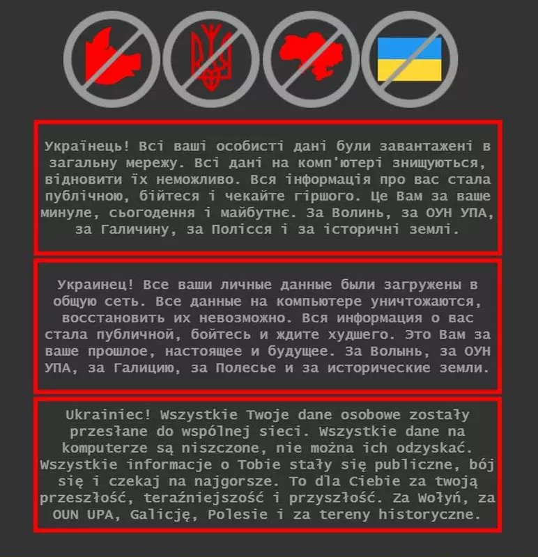 Nieznani hakerzy zostawili wiadomość w języku ukraińskim, rosyjskim i polskim na stronach wydziałów, których treść można znaleźć na poniższym zrzucie ekranu.