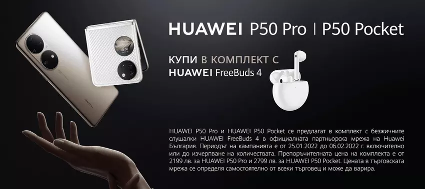 Huawei P50 Pro będzie dostępny w Bułgarii z 8 GB pamięci RAM i 256 GB pamięci wewnętrznej za 1125 euro w kolorze złotym i czarnym. Huawei P50 Pocket w kolorze Ceramic White będzie kosztował 1435 euro, będzie też sprzedawany w wersji o pojemności 8/256 GB.