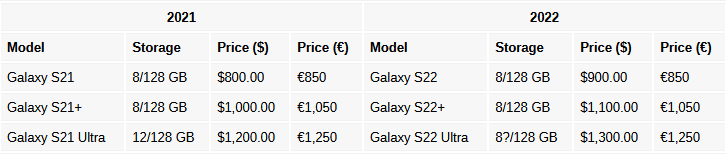Przeciek: flagowce Samsung Galaxy S22 będą kosztować o 100 USD więcej niż Galaxy S21, ale nie wszędzie