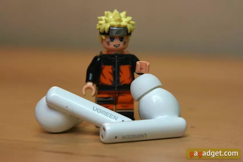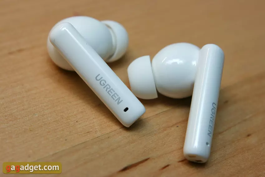 Na każdej słuchawce znajdują się trzy otwory: jeden na końcu „nogi”, drugi u jej podstawy, a trzeci obok głośnika. Można by przypuszczać, że wszystkie z nich są wykorzystywane przez mikrofony do aktywnej redukcji szumów, ale opis produktu odnosi się tylko do dwóch mikrofonów, które wspomaga sztuczna inteligencja. Styki do ładowania znajdują się na końcu „nóg”. Na jego zewnętrznej części znajduje się logo Ugreen, niewidoczny przycisk dotykowy i ta sama niewidoczna biała dioda LED. Oczywiście niewidoczne, gdy nie świeci. I świeci tylko przez krótką chwilę, gdy skrzynka ładująca jest otwarta, innych przypadków nie zauważyłem. Po wewnętrznej stronie „nóg” słuchawki sygnowane są literami L i R.