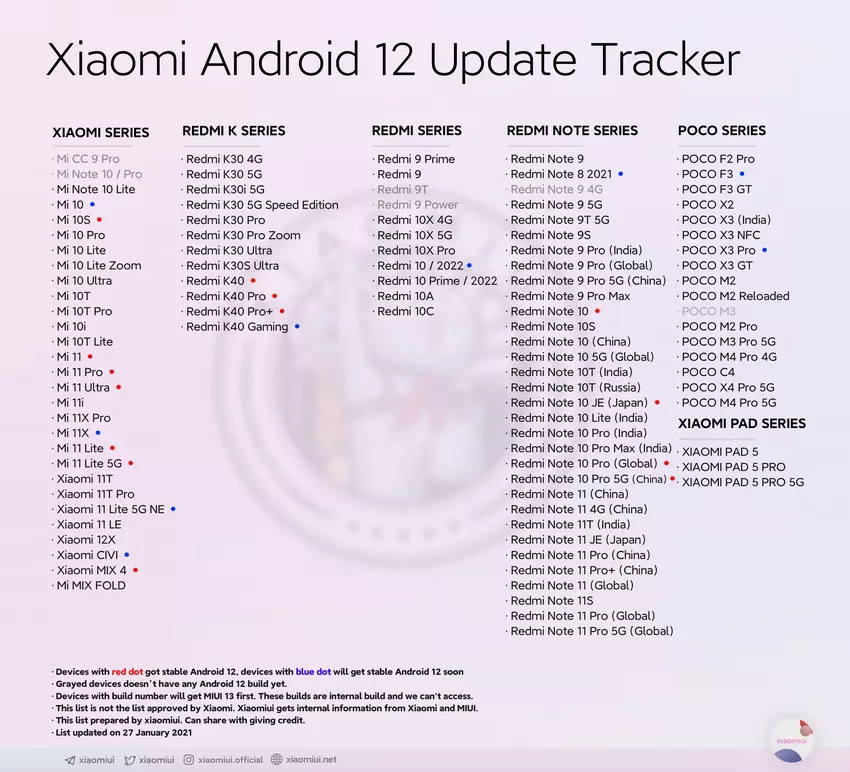 Ponieważ lista zawiera setki modeli na raz, nie wymienimy wszystkich urządzeń. Możesz sprawdzić poniższą listę. Zwróć uwagę, że Android 12 w ramach MIUI 13 jest już dostępny dla Xiaomi MIX 4, Xiaomi Mi 11 Lite 4G / 5G, Xiaomi Mi 11, Xiaomi Mi 11 Pro / Ultra, Xiaomi Mi 10S, Redmi K40, Redmi K40 Pro / Pro+, Redmi Note 10/10 JE, Redmi Note 10 Pro i Redmi Note 10 Pro 5G.