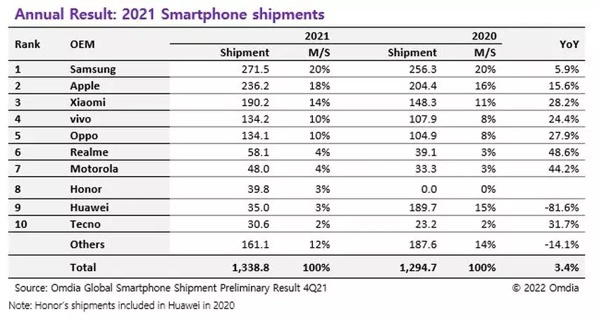 Na koniec roku Huawei nadal znajduje się w pierwszej dziesiątce. W porównaniu do 2020 roku dostawy spadły o 81,6%. Firmę wyprzedziły Motorola (4%) i Honor (3%), ale wciąż wyprzedza Tecno (2%). Całkowite dostawy smartfonów w tym roku wyniosły 1,3388 mld sztuk (+3,4%).