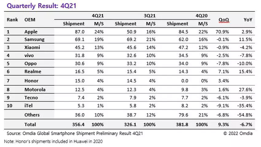 Omdia, w przeciwieństwie do Counterpoint, oferuje spojrzenie nie na pierwszą piątkę, ale na pierwszą dziesiątkę największych producentów. Według wyników IV kwartału liderem jest Apple z dostawami na poziomie 87 mln i 24% udziałem. Samsung sprzedał 69,1 mln smartfonów i zabrał 19%. Udział Xiaomi wyniósł 13% (45,2 mln sztuk).