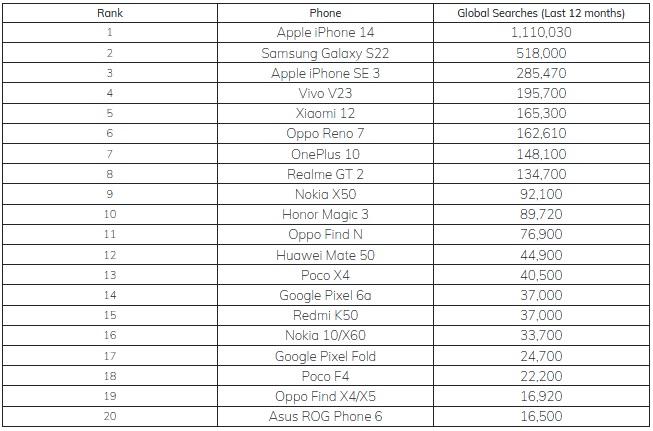 Badacze rynku telefonów komórkowych Mozillion przeanalizowali liczbę zapytań w wyszukiwarce Google i na podstawie tego badania skompilowali