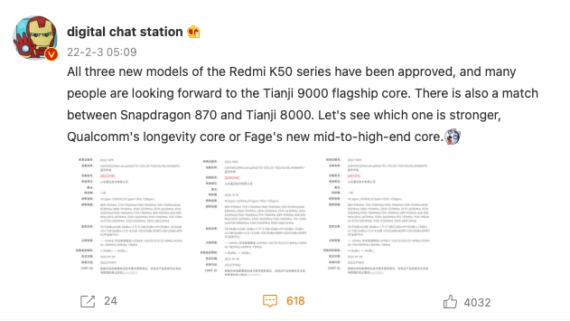 Certyfikowane przez Xiaomi smartfony Redmi K50 z chipami Snapdragon 870, Dimensity 8000 i Dimensity 9000 na pokładzie