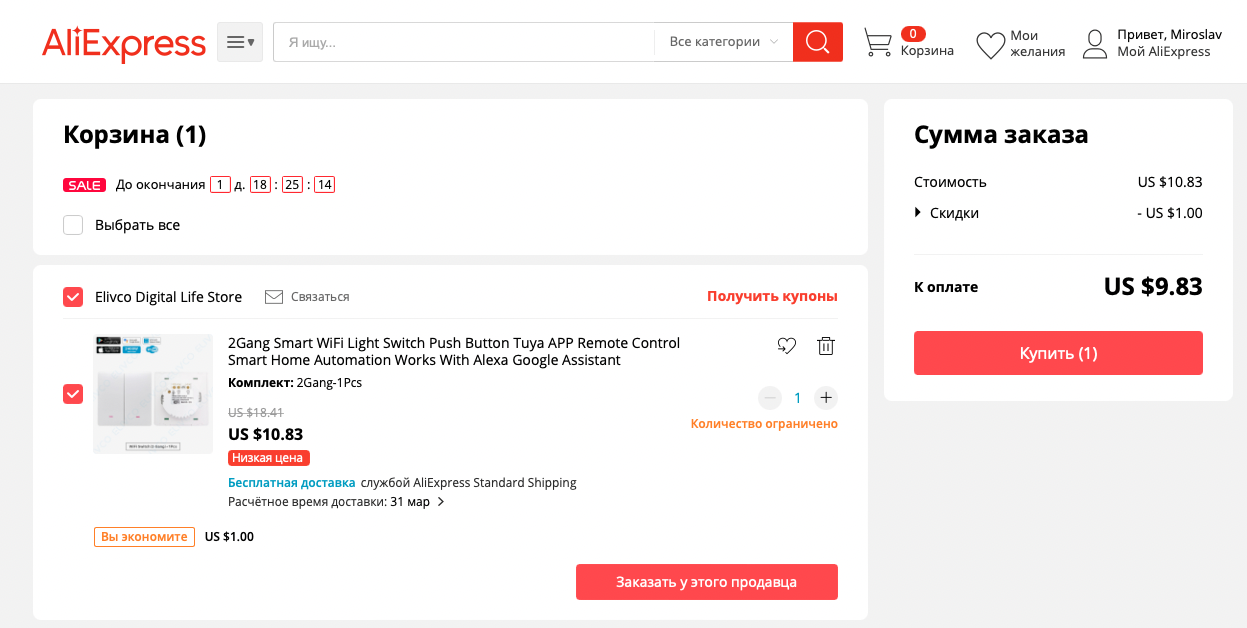 Kup przełącznik Tuya jest już dostępna na Aliexpress z kuponem sprzedawcy za 10$.