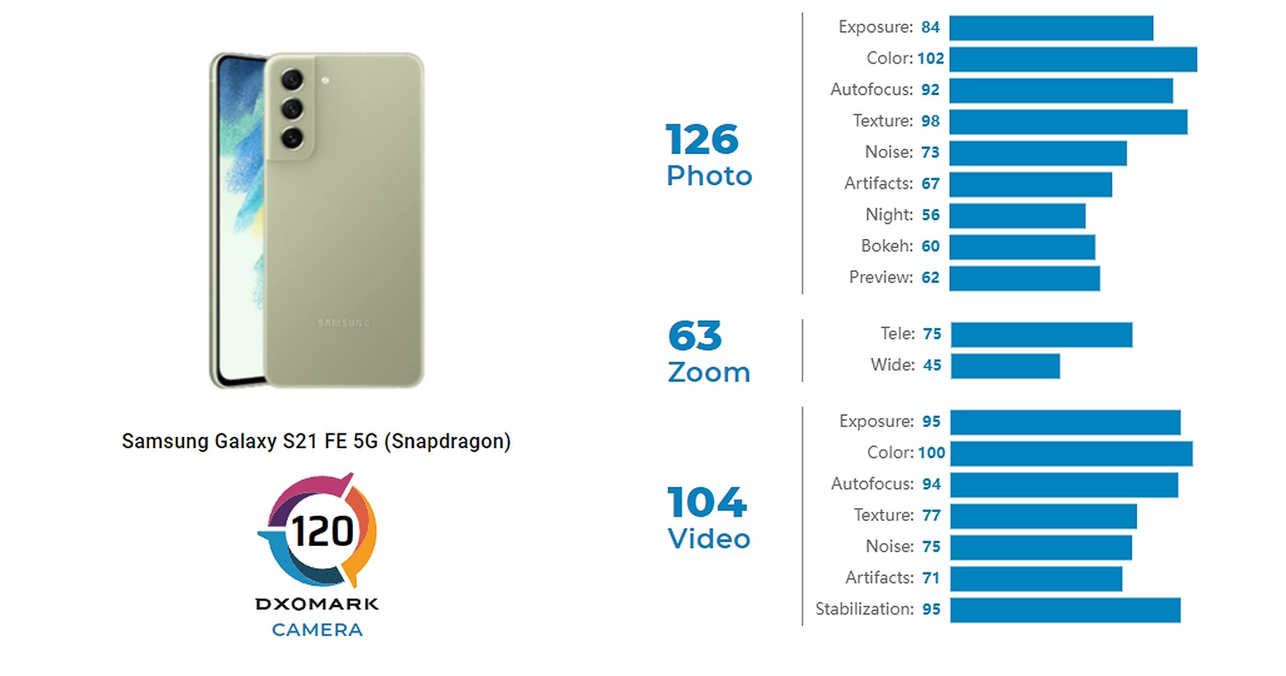 W efekcie Galaxy S21 FE otrzymał 120 punktów: 126 za zdjęcie, 63 za zoom i 104 za wideo.