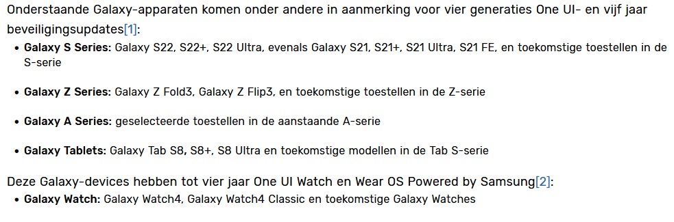 Początkowo informowano, że modele z serii Galaxy S oraz Galaxy Tab S 2021, 2022 i nowsze otrzymają rozszerzone wsparcie. Jednak w wersji holenderskiej