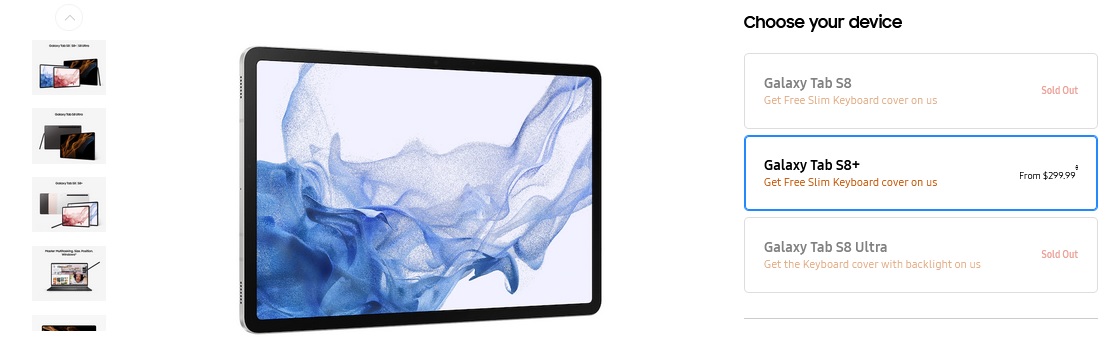 Mówimy o rynku amerykańskim. Nie ma jeszcze możliwości zamówienia podstawowego modelu Galaxy Tab S8 i zaawansowanego Galaxy S8 Ultra na oficjalnej stronie Samsunga – są one wymienione jako „Sprzedane”.