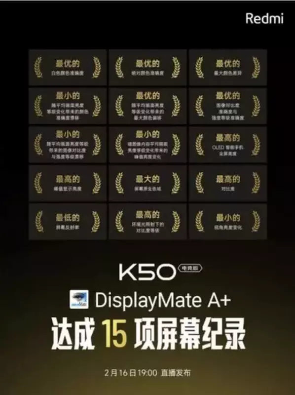 Nowy plakat ujawnia, że Redmi K50 Gaming Edition pobił 15 rekordów: DisplayMate przyznał urządzeniu ocenę A+. Tak więc doniesiono, że wyświetlacz smartfona ma najwyższy poziom kontrastu, balansu bieli i dokładności kolorów spośród wszystkich smartfonów. Raport stwierdza również, że