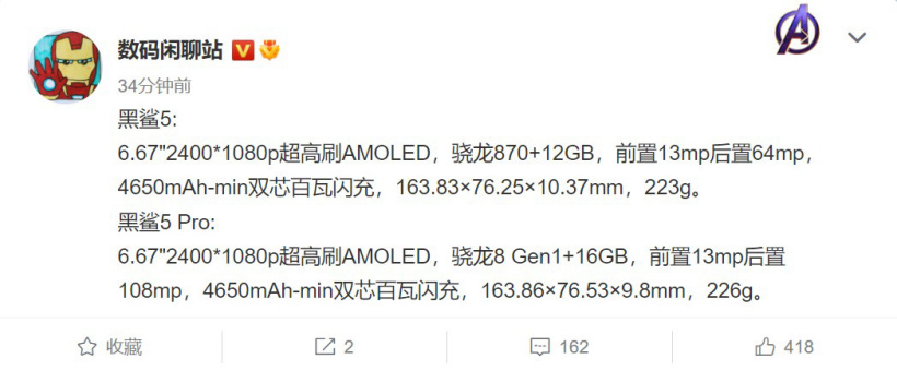Chipy Snapdragon 870/Snapdragon 8 Gen 1, do 16 GB RAM i ładowanie 100 W: specyfikacje Black Shark 5 i Black Shark 5 Pro wyciekły online