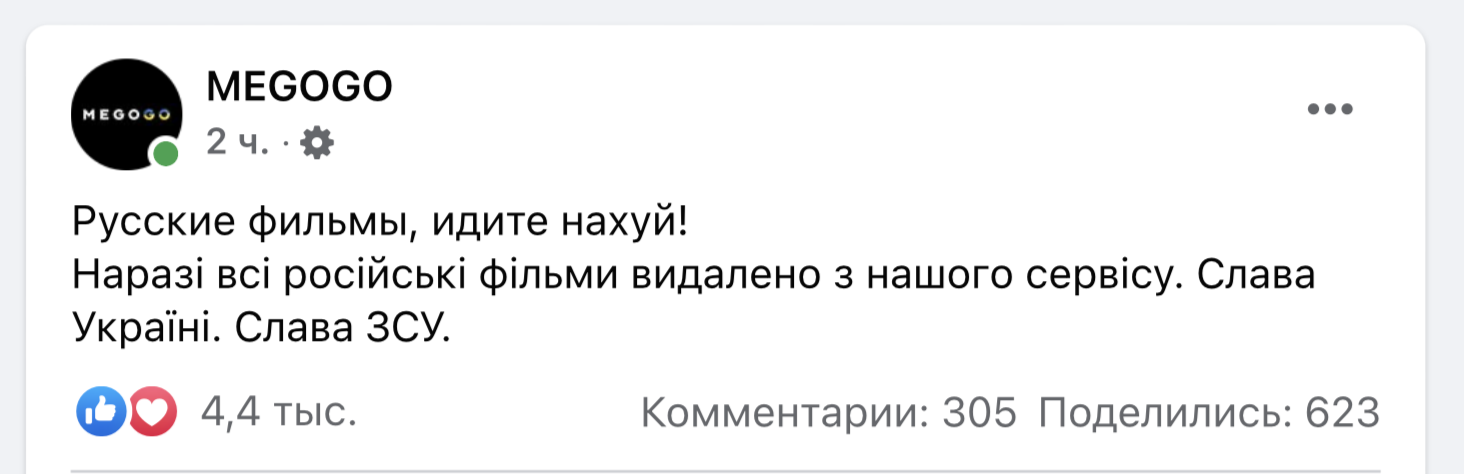 Firma Megogo ogłosiła na swoim Facebooku, że usunęła z platformy wszystkie filmy wyprodukowane przez Rosjan.