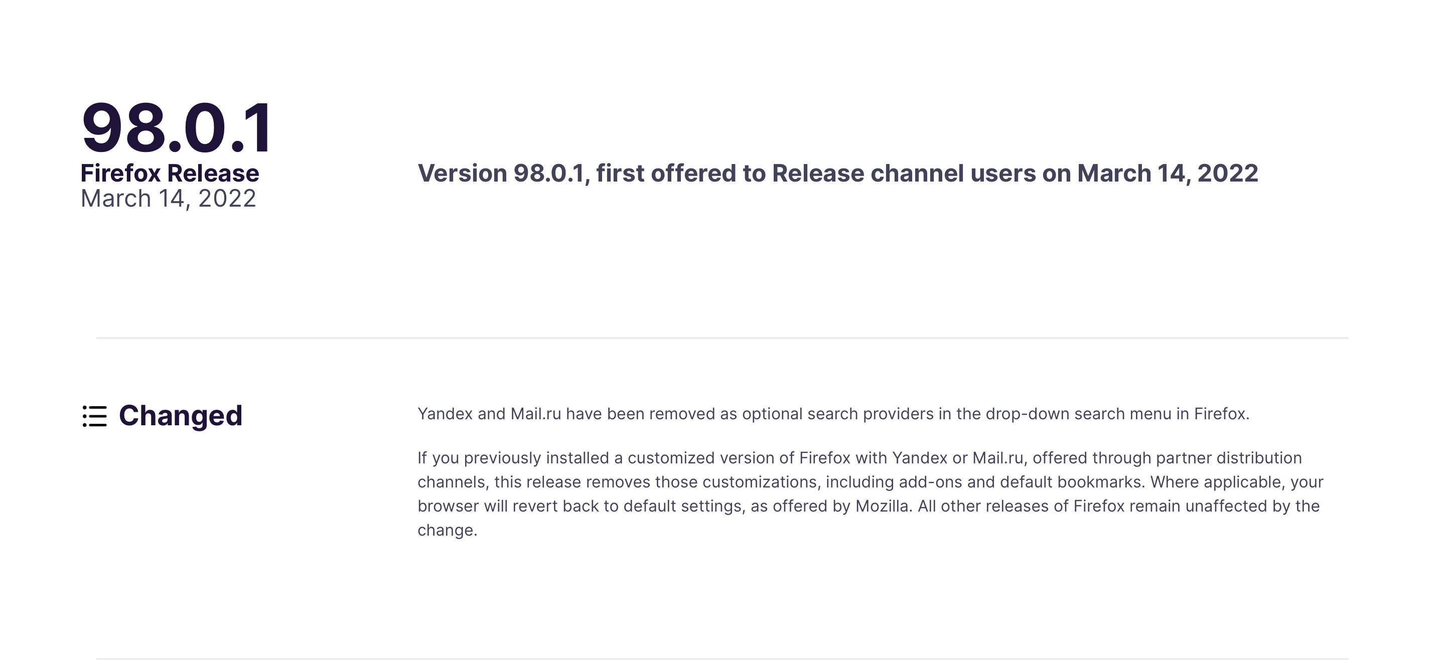 Mówimy o wyszukiwarkach Yandex i Mail.ru. Zniknęły z ustawień przeglądarki po Aktualizacje Firefoksa 98.0.1, który został wydany 14 marca.