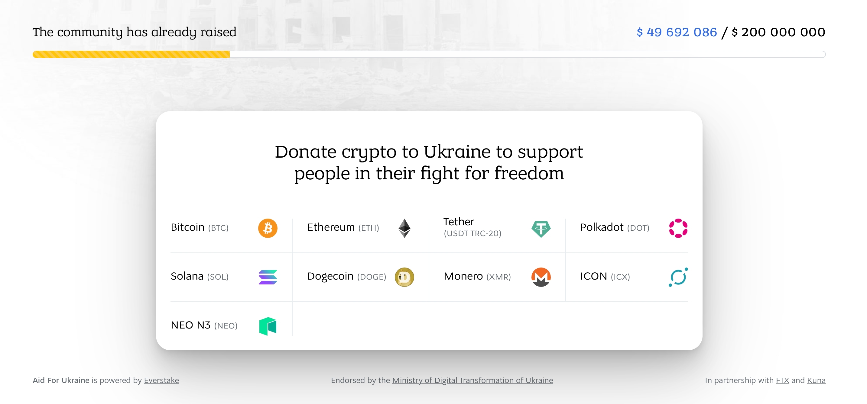 Ministerstwo Cyfrowej Transformacji Ukrainy wraz ze spółką Everstake i giełda kryptowalut FTX uruchomił stronę internetową Pomoc dla Ukrainy. Dzięki niemu ludzie z całego świata mogą przekazać kryptowalutę na pomoc Ukrainie. Strona akceptuje Bitcoin, Ethereum, Tether, Polkadot, Solana, Dogecoin, Monero, ICON i NEO N3. Nawiasem mówiąc, w momencie pisania wiadomości zebrano już prawie 50 000 000 dolarów.