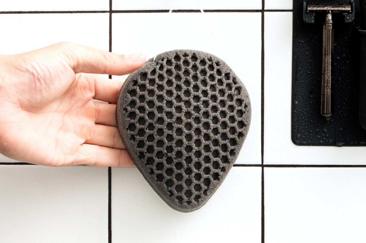 Chociaż gąbki Konjac nie wydają się nowe, w Internecie jest ich pełno. Jednak konstrukcja i infuzja szorowarki prysznicowej uwalniają jej potencjał. Duża konstrukcja w kształcie kostki do gitary ma z jednej strony fakturę plastra miodu, inspirowaną ręcznikami Casamera o strukturze wafla. Struktura plastra miodu jest delikatna dla skóry, szczególnie wokół oczu, pomaga otwierać pory i tworzy pianę. Jednak druga strona ma charakter fakturowy. Gąbka posiada drobinki łupin orzecha włoskiego osadzone na jej powierzchni. To złuszczające doświadczenie ujawni promienną, promienną skórę pod spodem.