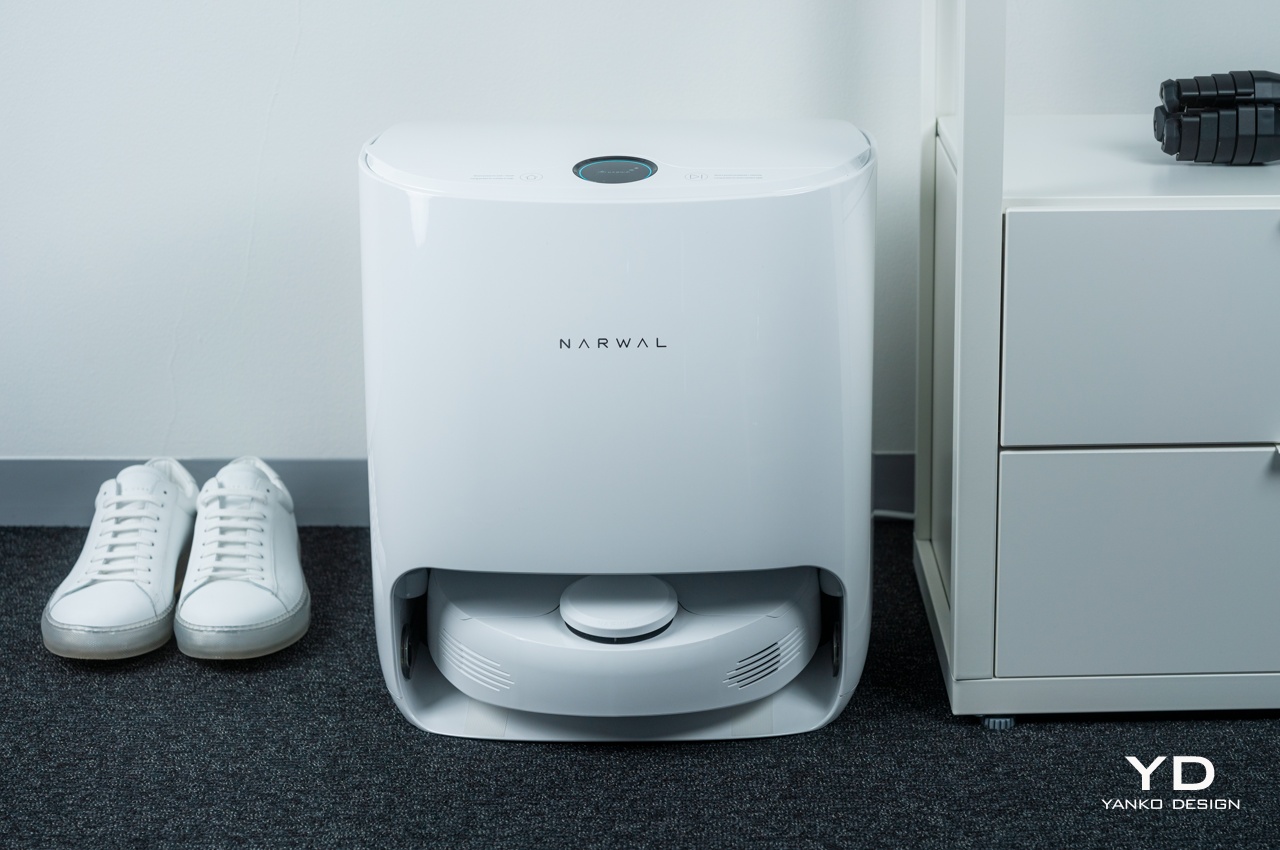 Narwal T10 natychmiast wyda się czymś zupełnie innym niż zwykły robot odkurzający, nawet ten z funkcjami mopowania i odkurzania 2 w 1. Podstawa robota jak i sam robot są w kolorze białym. Kolor ten kojarzy się z warunkami sanitarnymi i czystością. Choć emanuje bardziej minimalistycznym klimatem, brud i plamy mogą być lepiej widoczne na jego powierzchni.