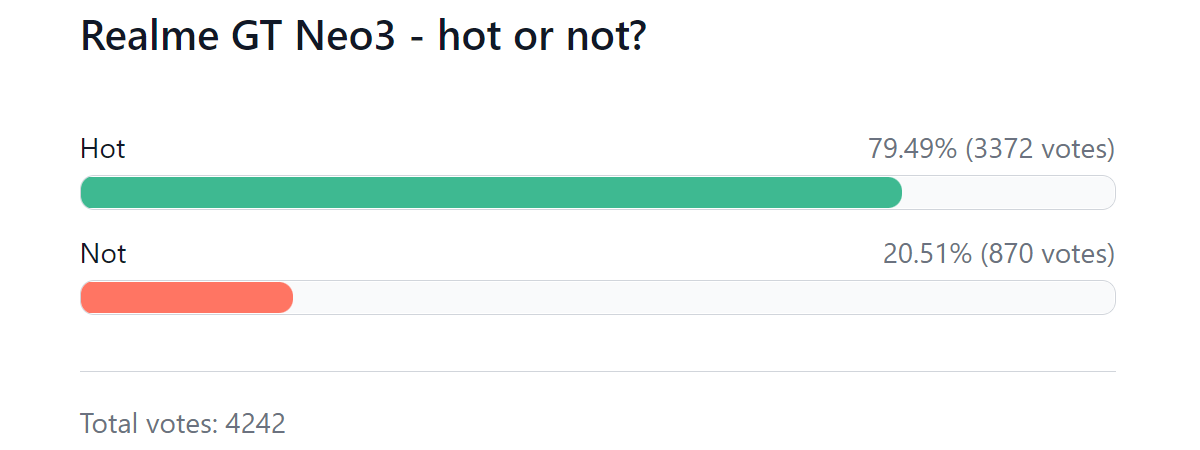 Realme to osiągnęło – Realme GT Neo3 został obsypany miłością w zeszłotygodniowym plebiscycie, w którym 80% głosów było na jego korzyść. Rzadko widzimy tak mocno faworyzowany telefon. Jego poprzednik, GT Neo2, uzyskał w sondażach lekko ujemny wynik.
