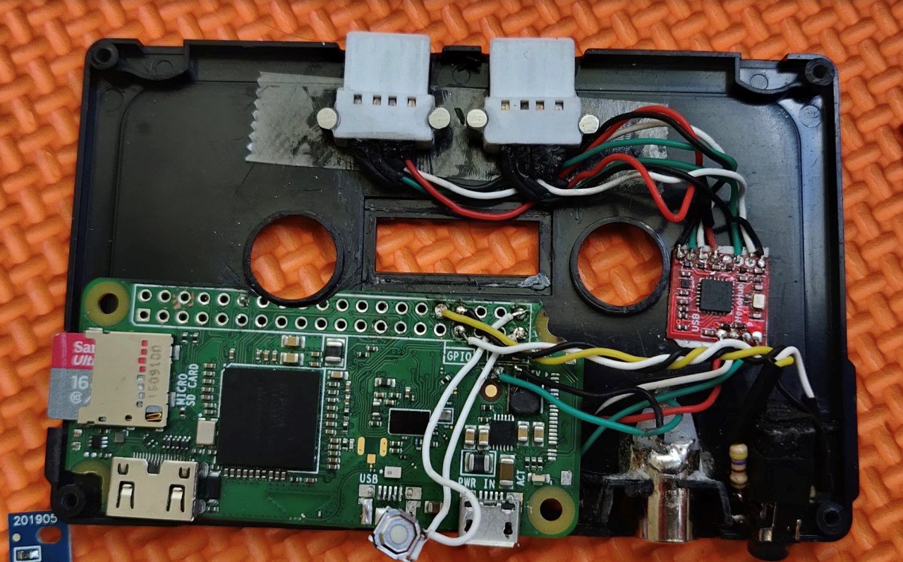 Stuart stanął w obliczu ograniczonego miejsca i zdecydował się na użycie Raspberry Pi Zero W. Stuart powiedział, że obudowy kaset są dobrym współczynnikiem kształtu. Jako punkt wyjścia użył prostej czarnej zapasowej obudowy kasety, a następnie użył bocznych obcinaków i ręcznego pilnika, aby wyciąć plastikowe wsporniki. Radiator pokazany na górze również został stworzony całkowicie od podstaw przy użyciu złomu i piły taśmowej. Do dopracowania kształtu użyto Dremela, pilników igłowych i drobnoziarnistego papieru ściernego.