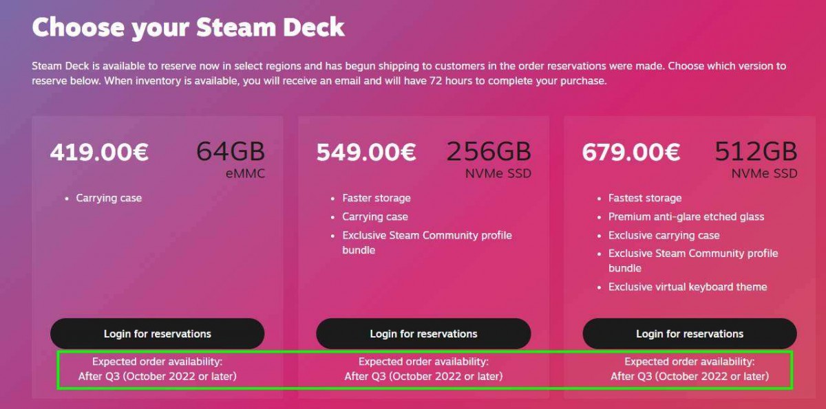 Szacuje się, że każdy z trzech poziomów Steam Deck zamówionych teraz pojawi się w październiku, a być może później. Według Lawrence'a Yanga z Valve w an wywiad z IGN w lutym wzrost produkcji nastąpi bardzo szybko – dziesiątki tysięcy w pierwszym miesiącu, setki tysięcy w drugim.