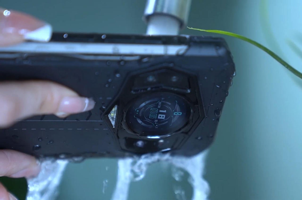 Zamiast dużego guzka na plecach, Doogee S98 ma praktycznie okrągły smartwatch otoczony kamerami i lampą błyskową LED. Działa tak samo, jak inne drugie ekrany, z wyjątkiem tego, że wygląda dobrze w tej pozycji, a nie jako coś, co jest po prostu przyczepione. Nadaje telefonowi niemal futurystyczny klimat lub cyberpunk, biorąc pod uwagę jego raczej przemyślaną skórę.
