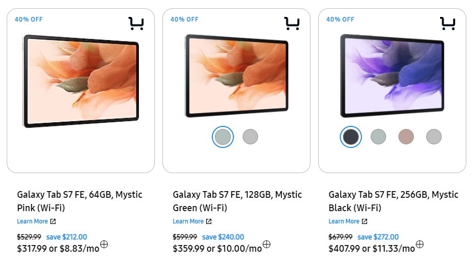 Jedna z najwyższych zniżek dotyczy Galaxy Tab S7 FE – modele Wi-Fi (64, 128 i 256 GB) są tańsze o 40%, więc cena zaczyna się od 318 USD.