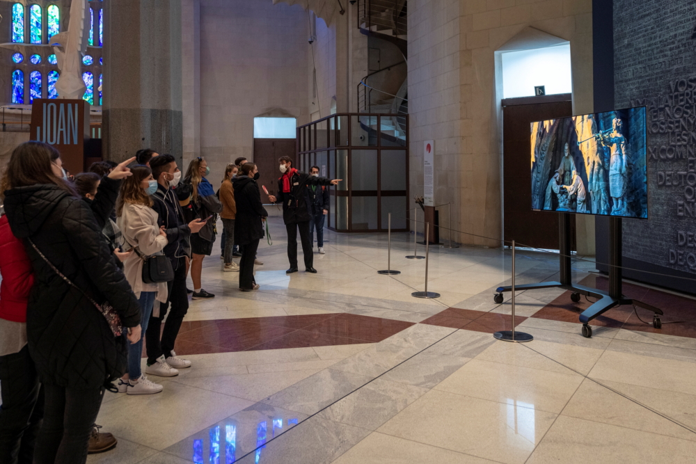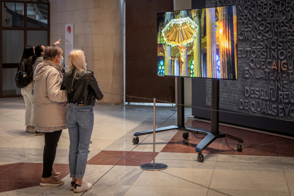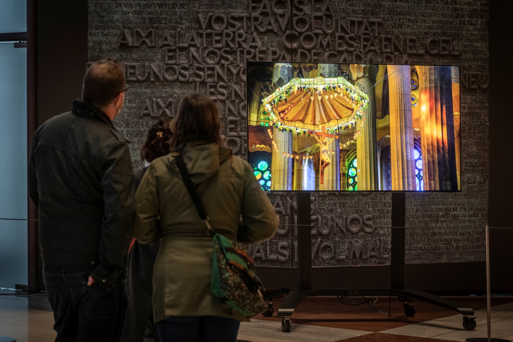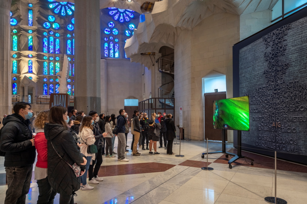 ^ Odwiedzający Sagrada Familia w Barcelonie w Hiszpanii oglądają wideo pokazujące piękno katedry na Samsungu Neo QLED 8K.