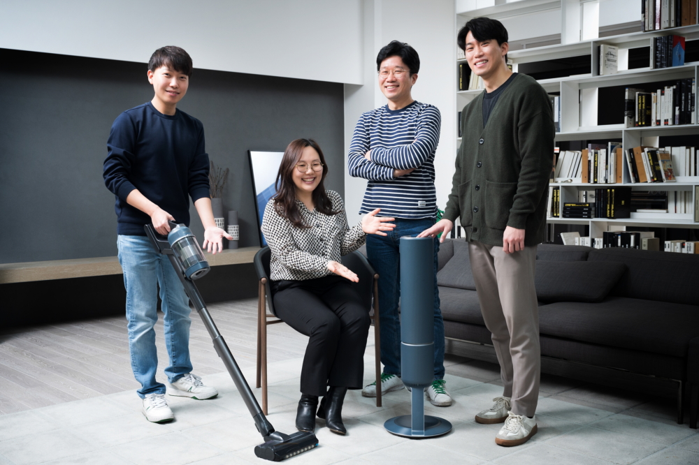 (Od lewej do prawej) Inżynierowie odkurzacza Hun Kang, Yoonkyung Cho, Jongkuk Lim i Daon Lee pozują z Bespoke Jet(tm) i jego All-in-One Clean Station(tm), najnowszym innowacyjnym odkurzaczem bezprzewodowym firmy Samsung, który pomogli życie.