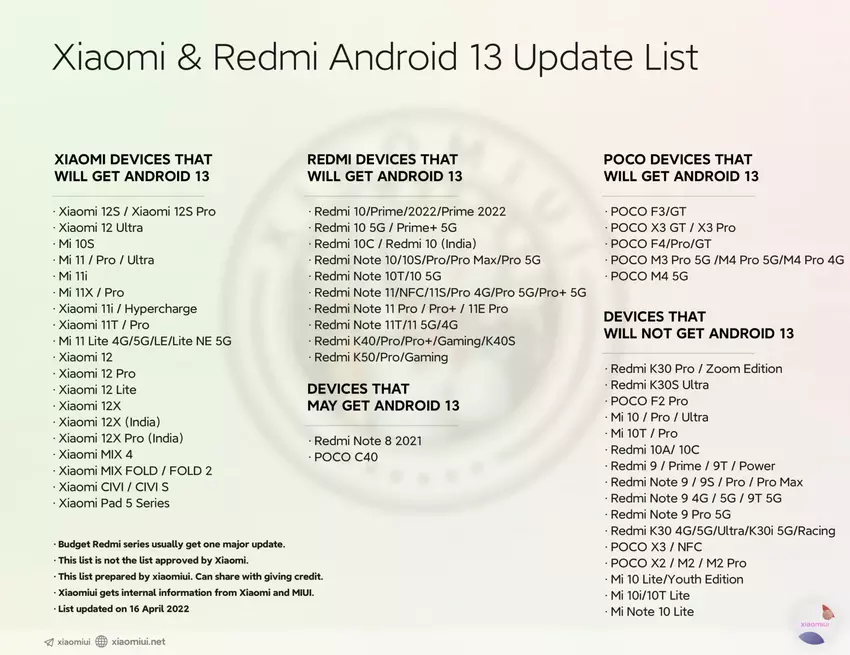 Wydanie xiaomiui opublikowane listy smartfonów Xiaomi, Redmi i POCO, dla których system operacyjny będzie dostępny w dającej się przewidzieć przyszłości Android trzynaście.