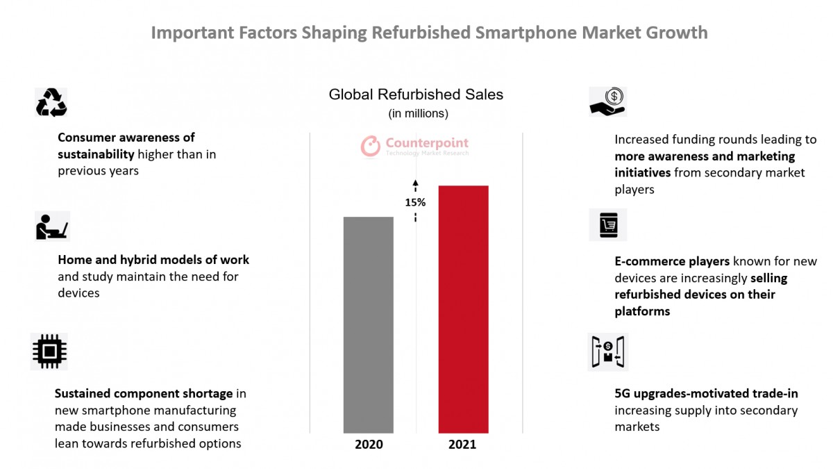 Rynek odnowionych smartfonów wzrósł w 2021 roku o 15% w porównaniu z rokiem poprzednim, przewyższając 4,5% wzrost rynku nowych smartfonów. Badania kontrapunktów donosi, że odnowione jednostki zyskują na popularności zarówno wśród konsumentów, jak i producentów smartfonów.