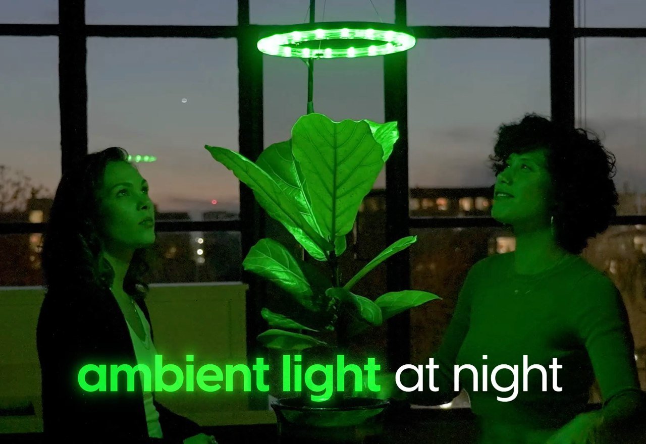 Kiedy lampa nie jest aktywna w uprawie twoich roślin, tryb otoczenia zamienia ją w pierścień światła otoczenia, który świeci w dowolnym kolorze, który wybierzesz do oświetlania domu. Tryb otoczenia pozwala lampie reagować na dźwięki muzyczne, dzięki czemu ludzie mogą doświadczyć CURA!