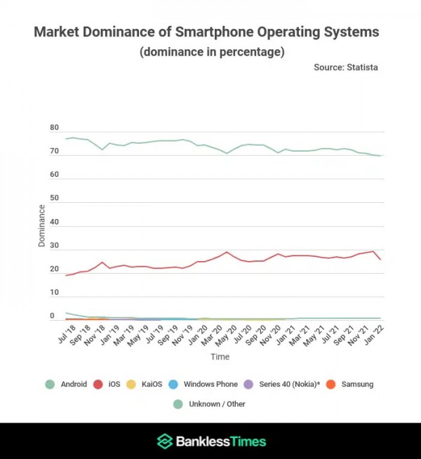 W 2018 r. Android miał 77,32% udziału w rynku, podczas gdy w tym roku szacuje się, że około 69,74% wszystkich urządzeń na świecie działa z Androidem. To prawie 8% spadek w ciągu czterech lat. Z kolei iOS wzrósł z 19,4% do 25,49% w tym samym okresie.