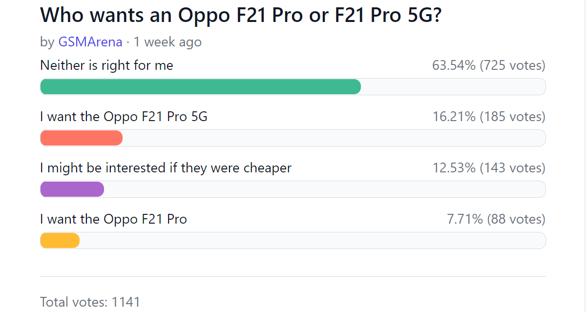Wyniki sondażu z zeszłego tygodnia pokazują, że może być nadzieja dla Oppo F21 Pro 5G. Znalazł niewielką grupę zwolenników, nawet przy obecnej cenie. A jeśli cena spadnie, jeszcze więcej osób mogłoby się do niej przyzwyczaić.
