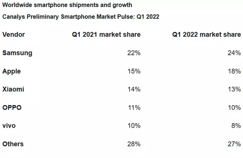 Z roku na rok przywództwo Samsunga pozostaje niezmienione: udział południowokoreańskiego producenta w pierwszym kwartale wyniósł 24%, co stanowi wzrost o 2% w porównaniu z tym samym okresem w 2021 roku. Jak twierdzą analitycy, Samsung przyspieszył produkcję swojej popularnej serii A, aby agresywnie konkurować w segmentach średnich i budżetowych, a także zaktualizował swoje portfolio na 2022 r. o flagową serię Galaxy S22.